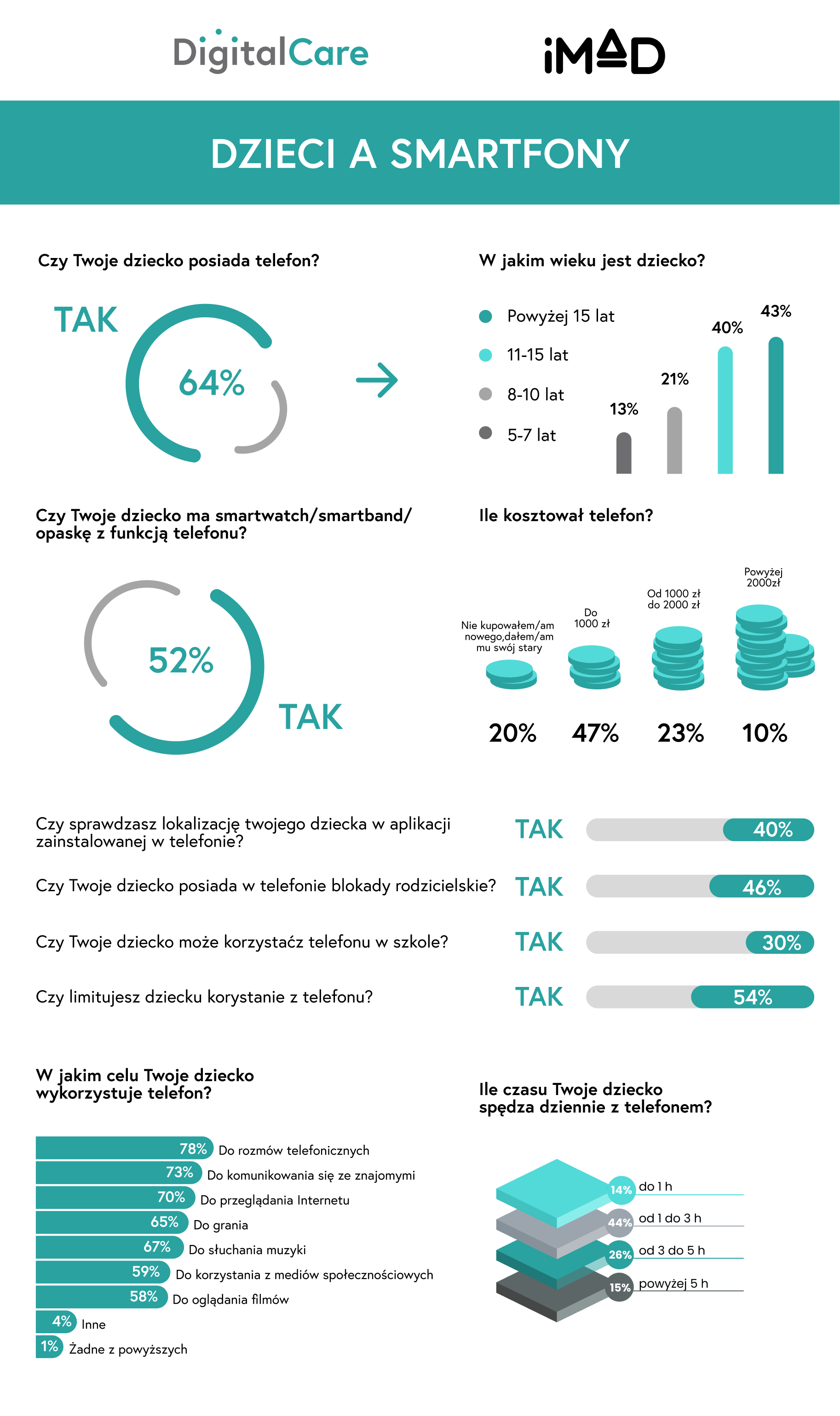 Digital Care w badaniu „Dzieci a smartfony” sprawdziło, jak rodzice podchodzą do zakupu smartfona oraz w jaki sposób ich dzieci korzystają z tego urządzenia. Najwięcej dzieci posiadających smartfon było w wieku powyżej 15 lat (43 proc.), 11-15 lat (40 proc.) i w grupie 8-10 lat (21%). Co ciekawe 13% miało zaledwie od 5 do 7 lat.
